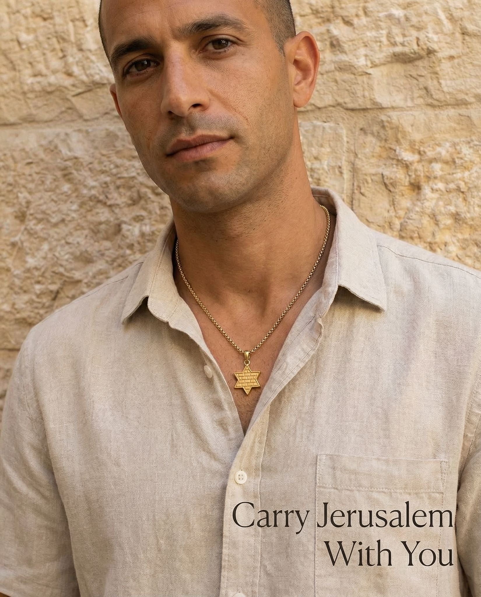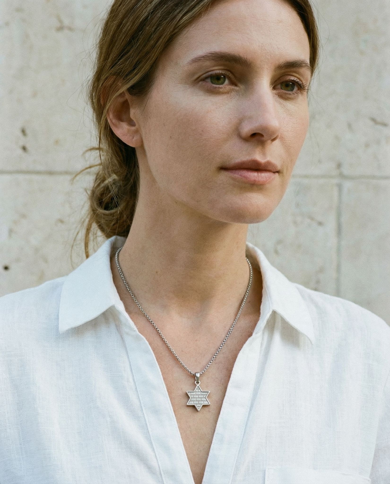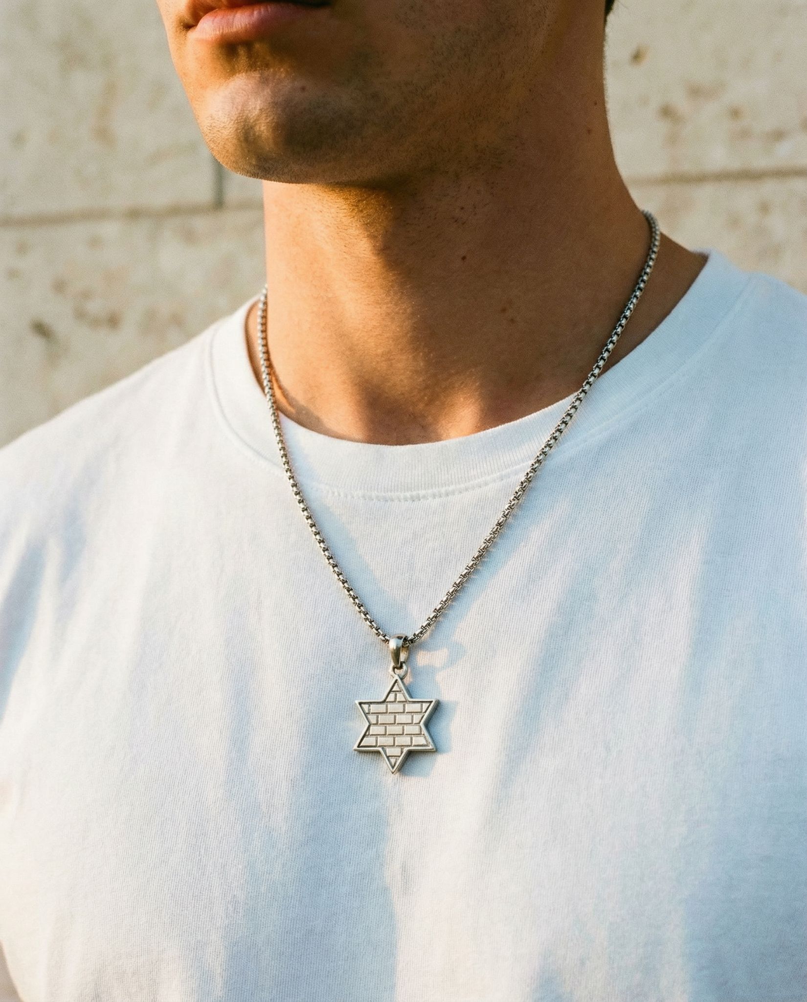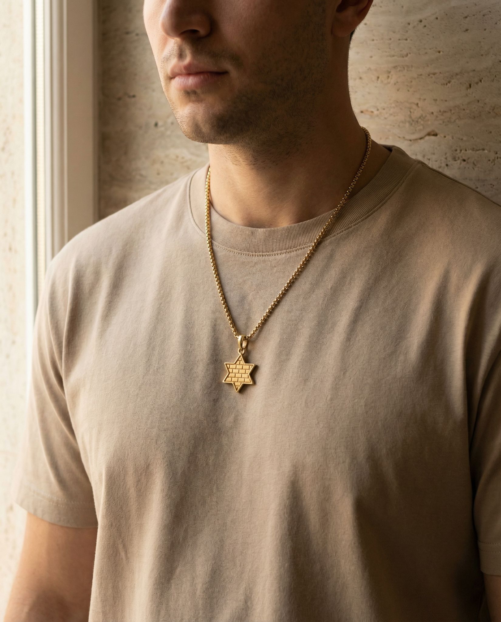 This Star of David necklace is inspired by the iconic stonework of Jerusalem’s Old City walls. Featuring a textured brick-style design, the pendant adds depth and meaning to a timeless symbol. Crafted from durable stainless steel, it’s designed for everyday wear while honoring tradition with a modern finish.