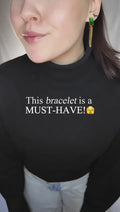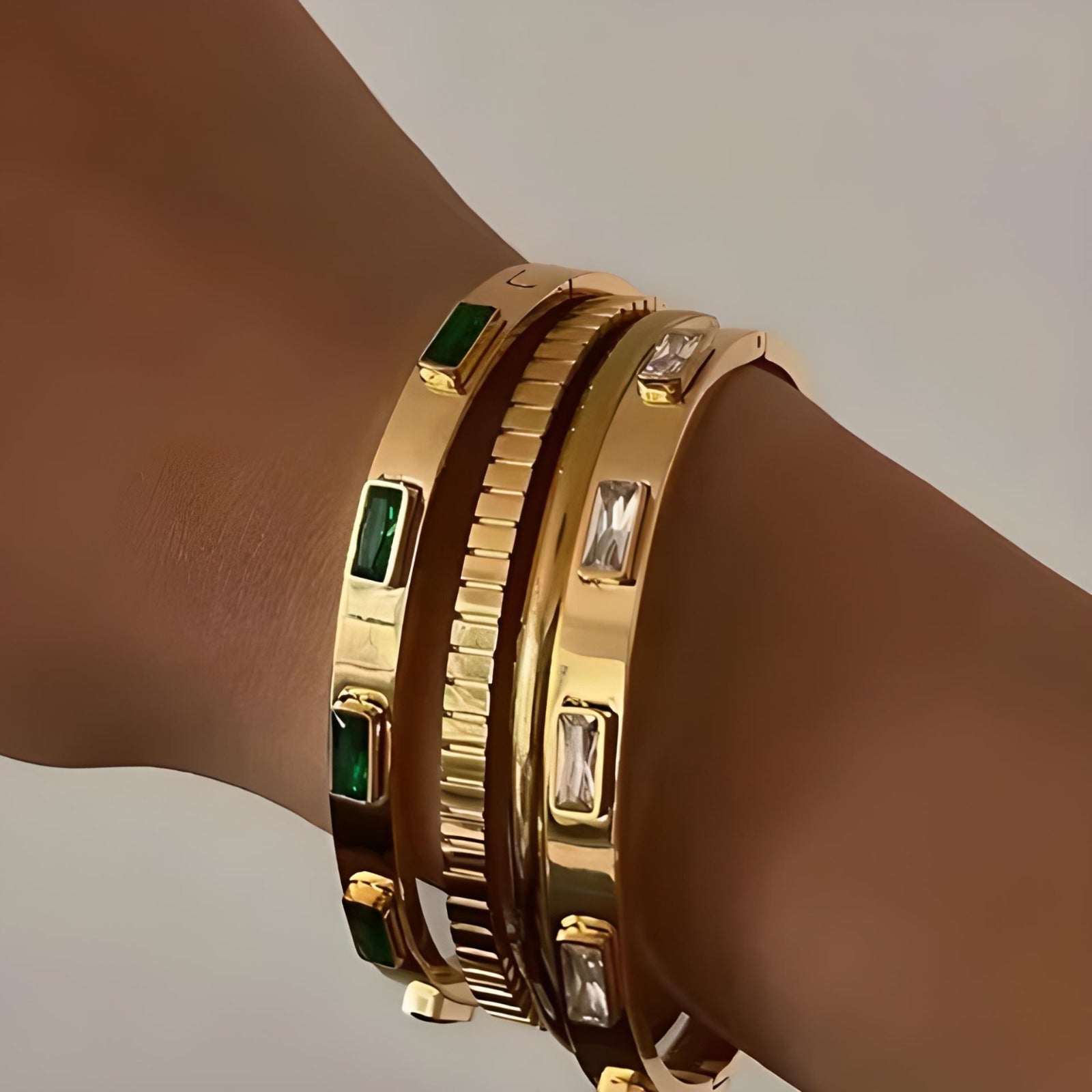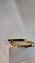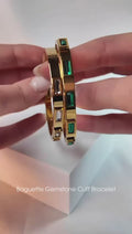 Add a touch of elegance to your outfit with this Baguette Gemstone Cuff Bracelet, featuring shimmering baguette-cut stones set in a sleek 18K gold-plated band.