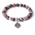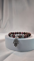 Discover balance and protection with this Rhodonite Hamsa Bracelet. Featuring rich pink and black natural rhodonite beads, this bracelet promotes emotional healing and harmony. The silver-plated Hamsa charm adds a touch of elegance and symbolizes protection and positivity.