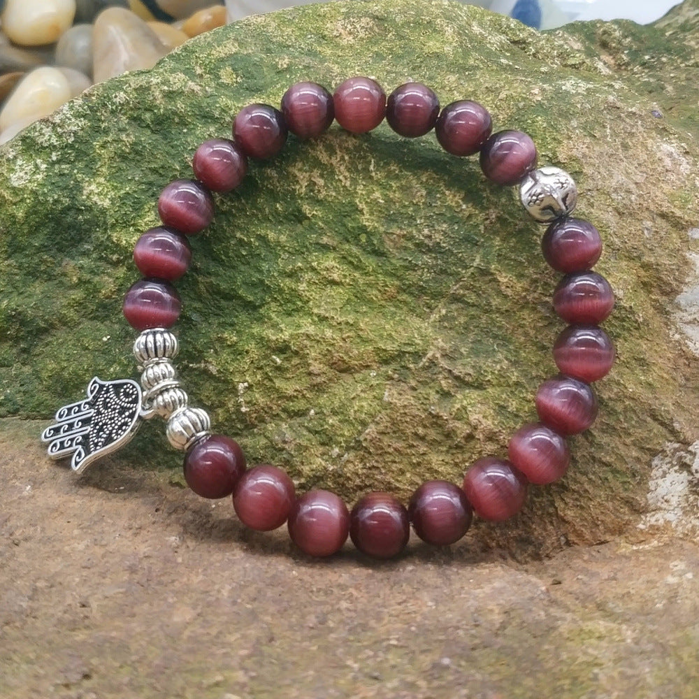 Channel strength and protection with this elegant garnet bead bracelet. Featuring rich garnet hues and a silver-plated Hamsa charm, this bracelet embodies positivity and resilience. Its elastic design ensures a comfortable, flexible fit for any wrist.