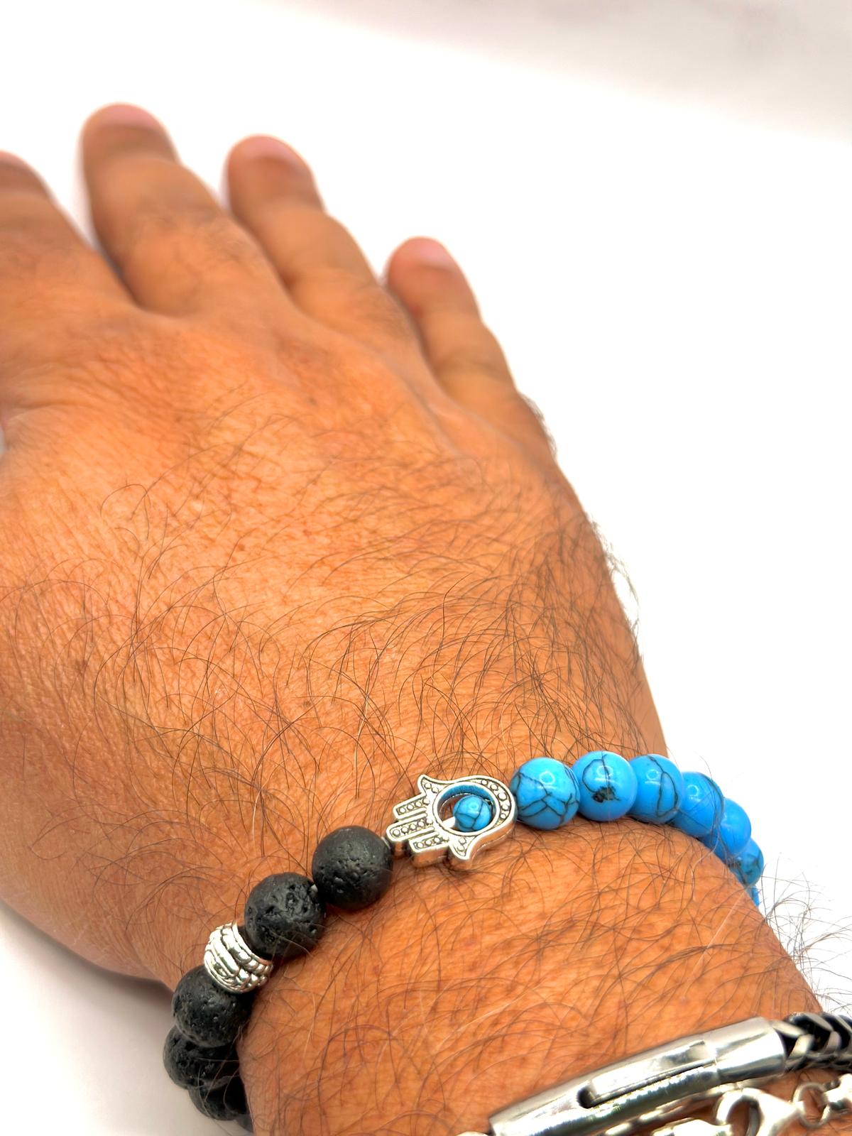 Hamsa Beaded Bracelet – Black Lava & Blue Howlite