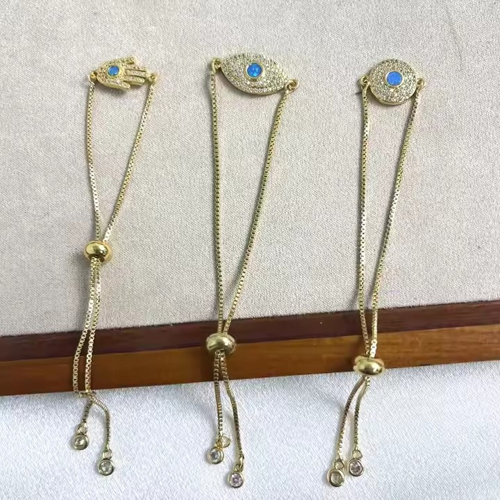 Elevate your style with this stunning collection of Hamsa, Evil Eye, and Circular Opal Charm Bracelets. Featuring meaningful designs adorned with luminous opal gemstones and sparkling crystal accents, these bracelets beautifully combine symbolism and elegance. Crafted with high-quality 18K gold plating, each bracelet can be purchased individually to reflect your personal style or as a complete set for a layered, cohesive look.