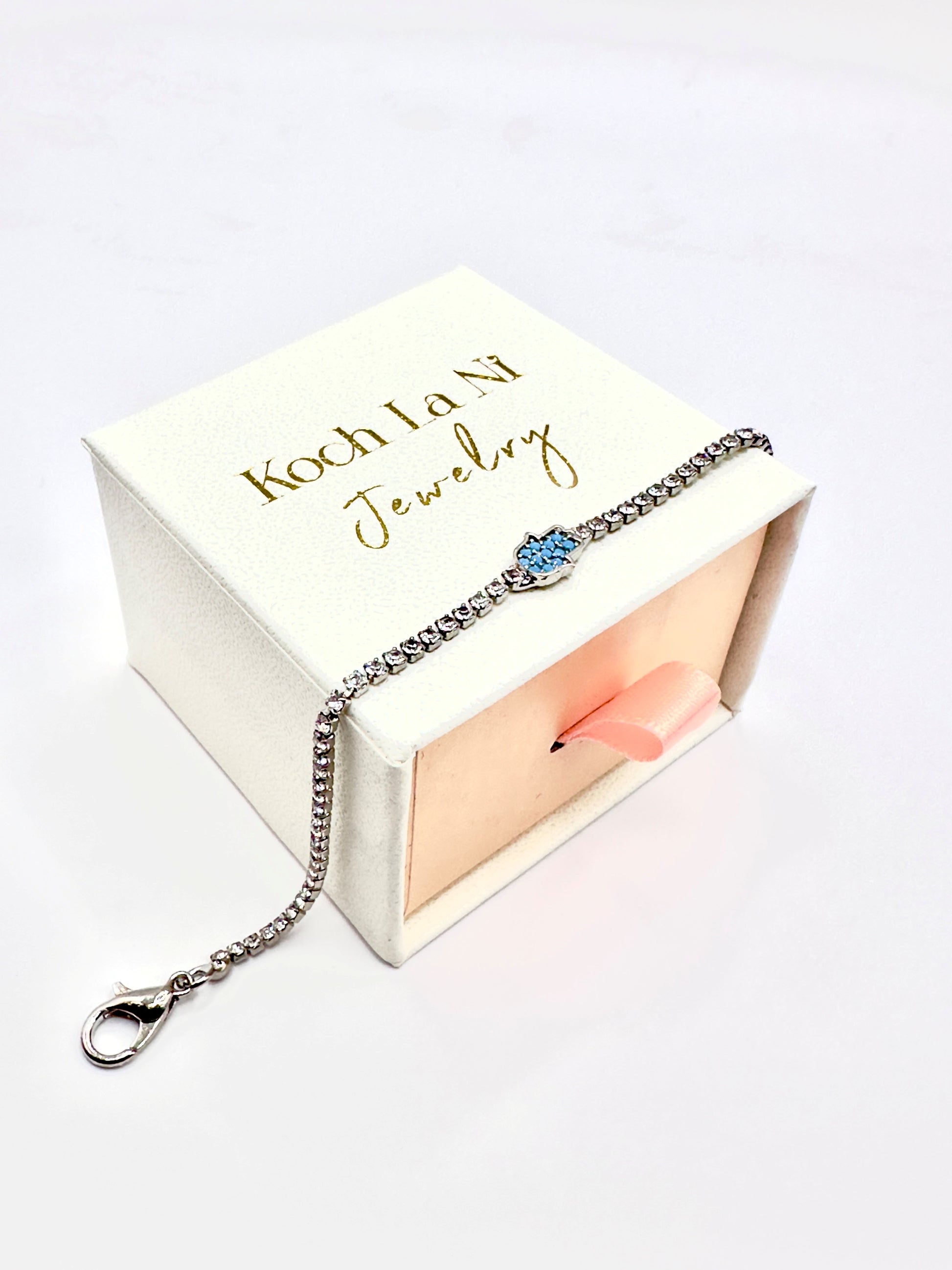 This elegant bracelet features a turquoise crystal Hamsa charm on a sparkling tennis chain — available in 18K gold or silver plating. A perfect mix of style, meaning, and shine for everyday wear.