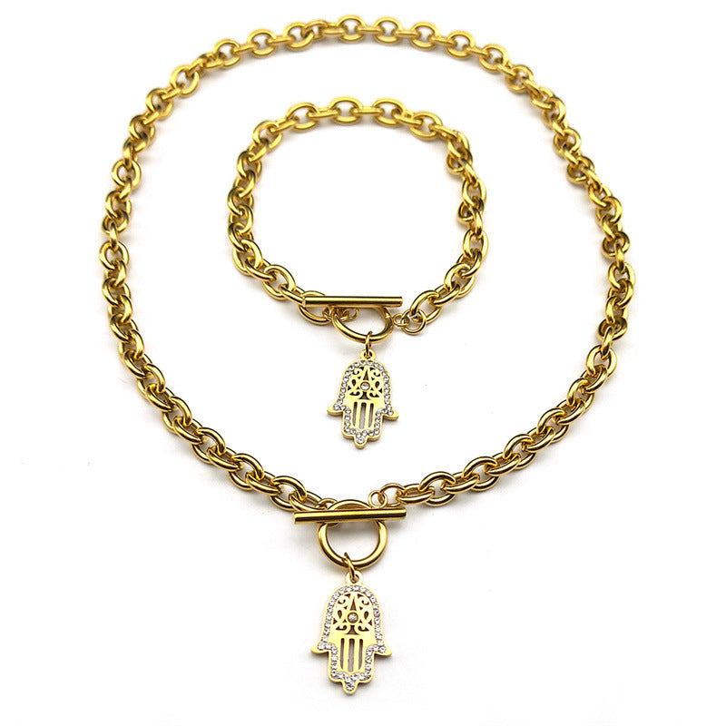 Make a statement with this Hamsa Pendant Necklace and Bracelet Set, a beautiful blend of elegance and symbolism. Featuring intricately designed Hamsa charms adorned with shimmering crystal accents, this set represents protection, blessings, and positive energy. Crafted with a durable link chain and finished with a stylish toggle clasp, it’s available in both 18K Gold-Plated and Silver-Plated options, allowing you to choose your perfect look.