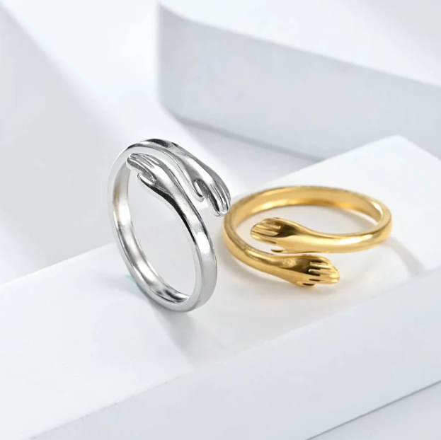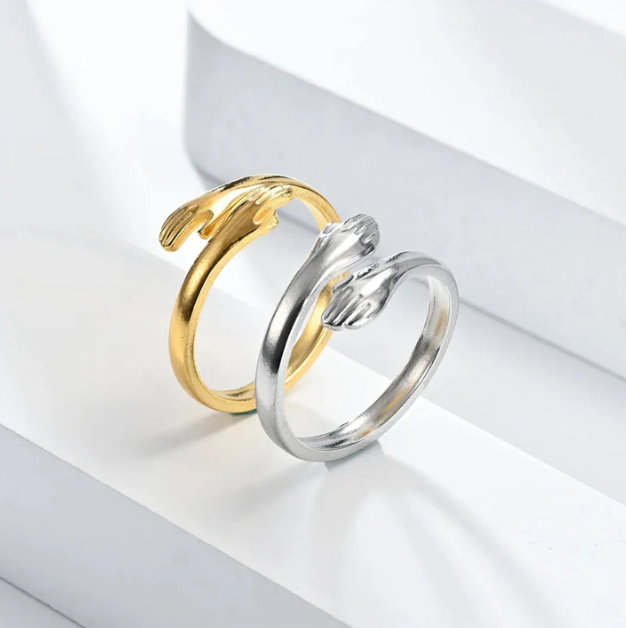 Celebrate connection and love with this Silver or Gold Stainless Steel Ring featuring a unique hugging arms design. Perfectly adjustable to fit any size, this ring is a meaningful piece for couples or anyone looking to carry a symbol of affection and togetherness.