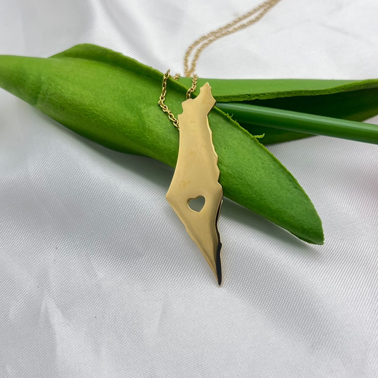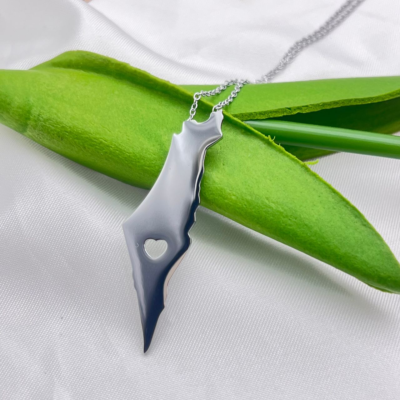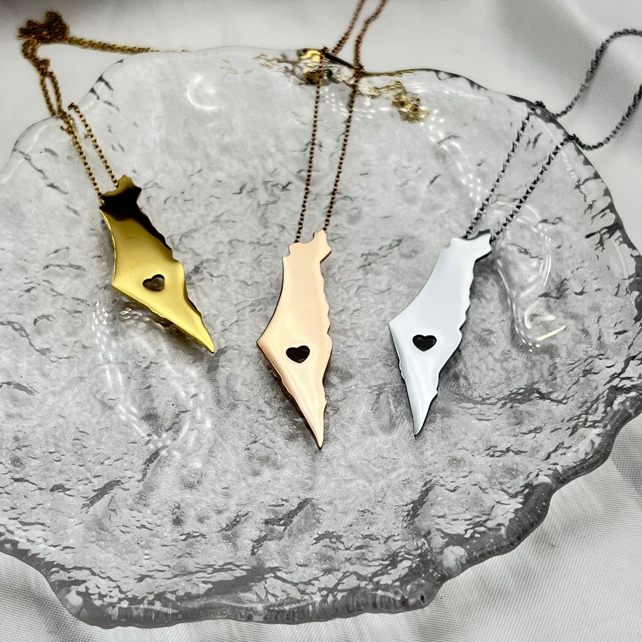 This minimalist necklace features a 2-inch (5.08 cm) pendant in the shape of Israel, with a heart cutout symbolizing love and connection to the land. It’s a simple yet meaningful piece.