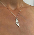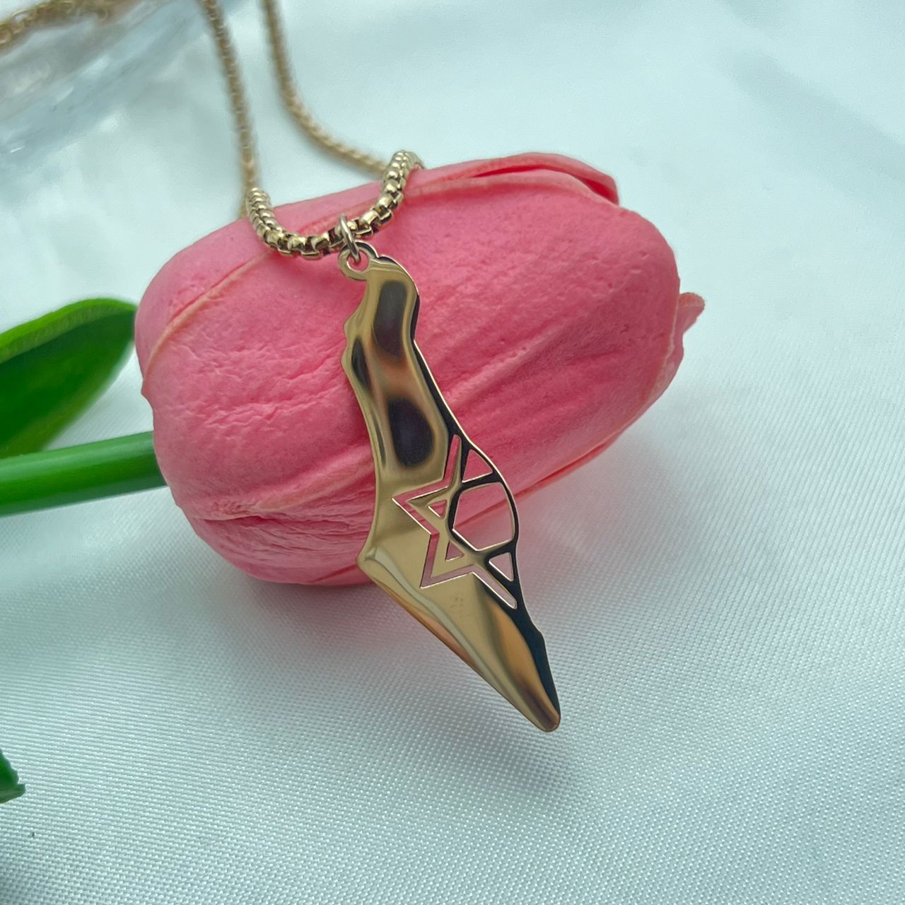 This minimalist necklace showcases a 1.5-inch pendant in the shape of Israel with a Star of David cutout, symbolizing pride and connection to heritage.