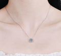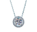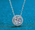 A timeless halo design featuring a 1 ct. D-color VVS1 Moissanite center stone, encircled by brilliant pavé accents. Set in platinum-plated solid sterling silver.