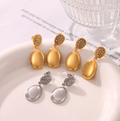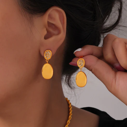 Elevate your style with these stunning 18K Gold Plated Oval Drop Earrings. Featuring a sleek, polished oval drop paired with a crystal-studded top, these earrings exude elegance and sophistication. Available in both gold and silver finishes, they are perfect for adding a touch of glamour to any outfit.