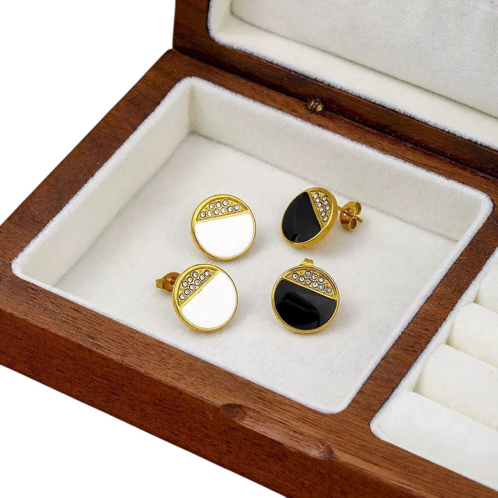 Modern round stud earrings with a sleek enamel finish and pavé crystal accent.
