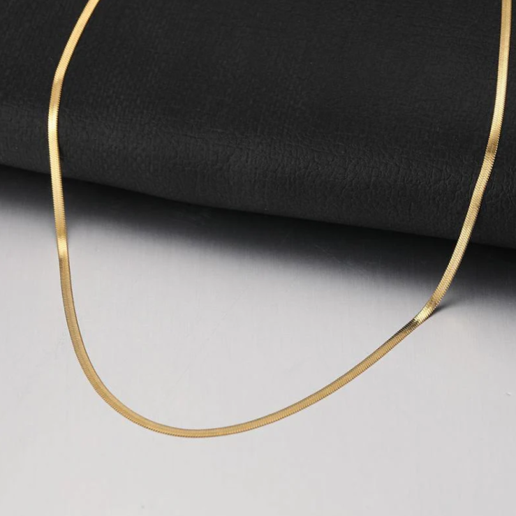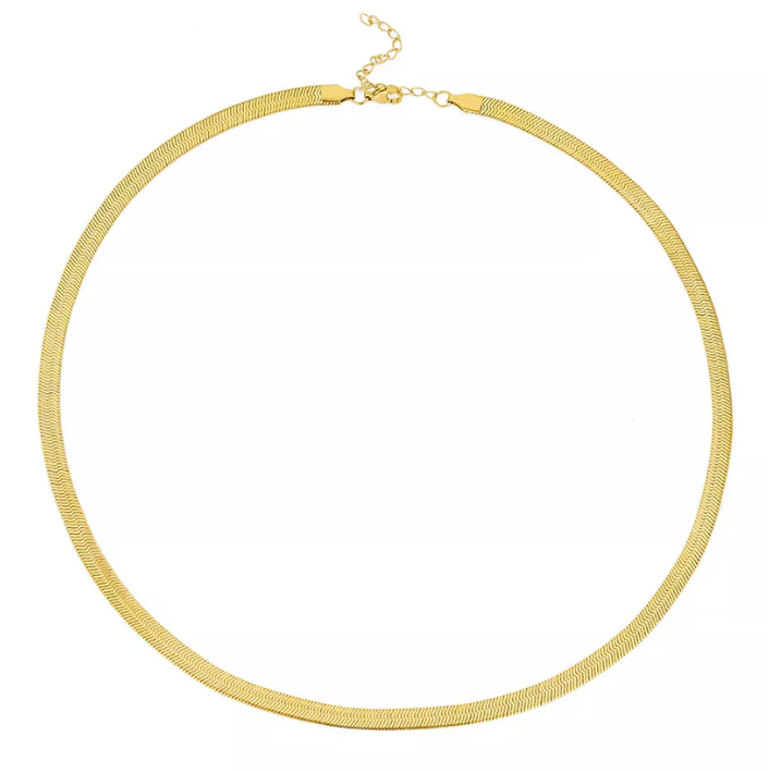 Sleek and polished, this 18K gold-plated herringbone chain offers a refined, fluid look that hugs the neckline. A timeless staple for everyday luxury.