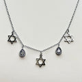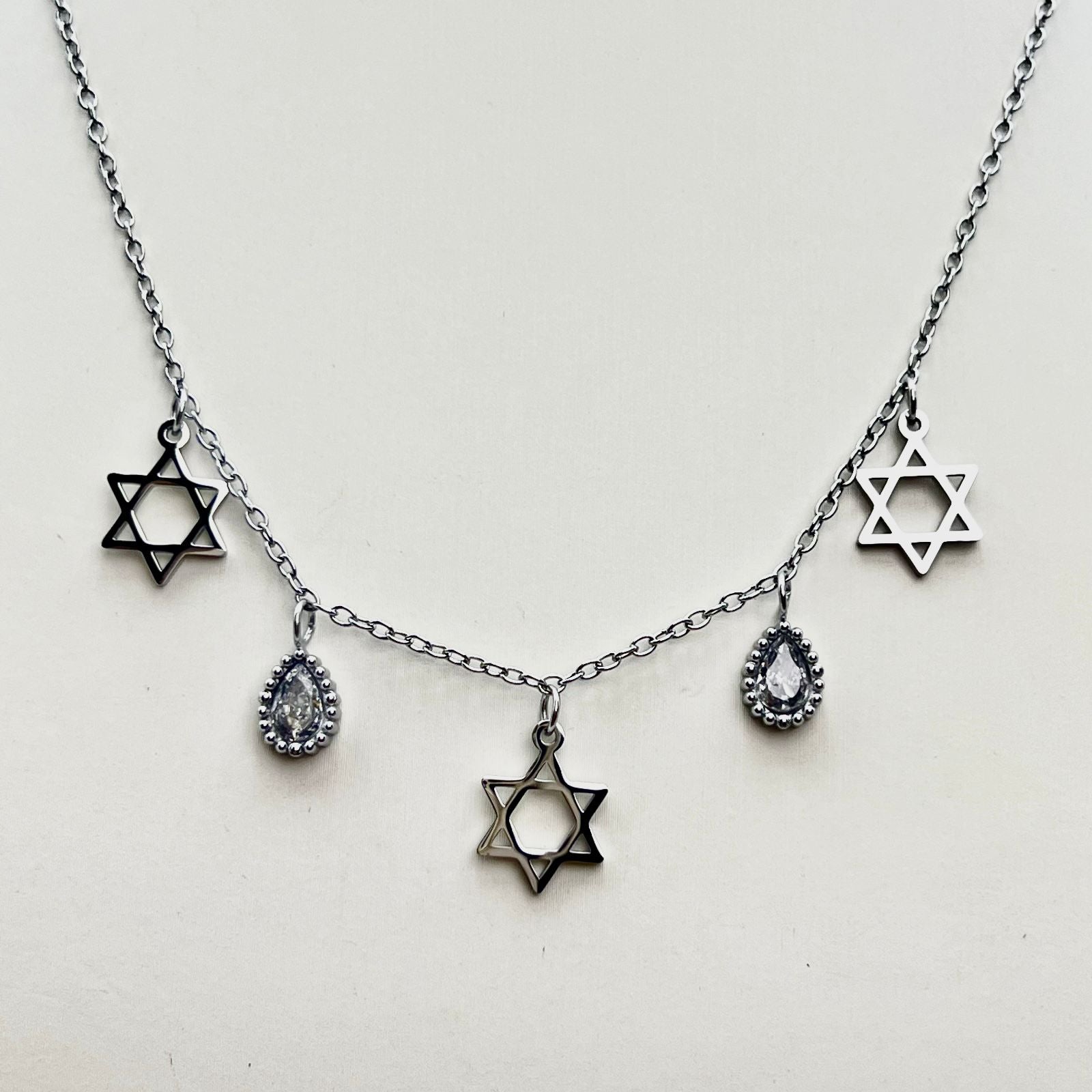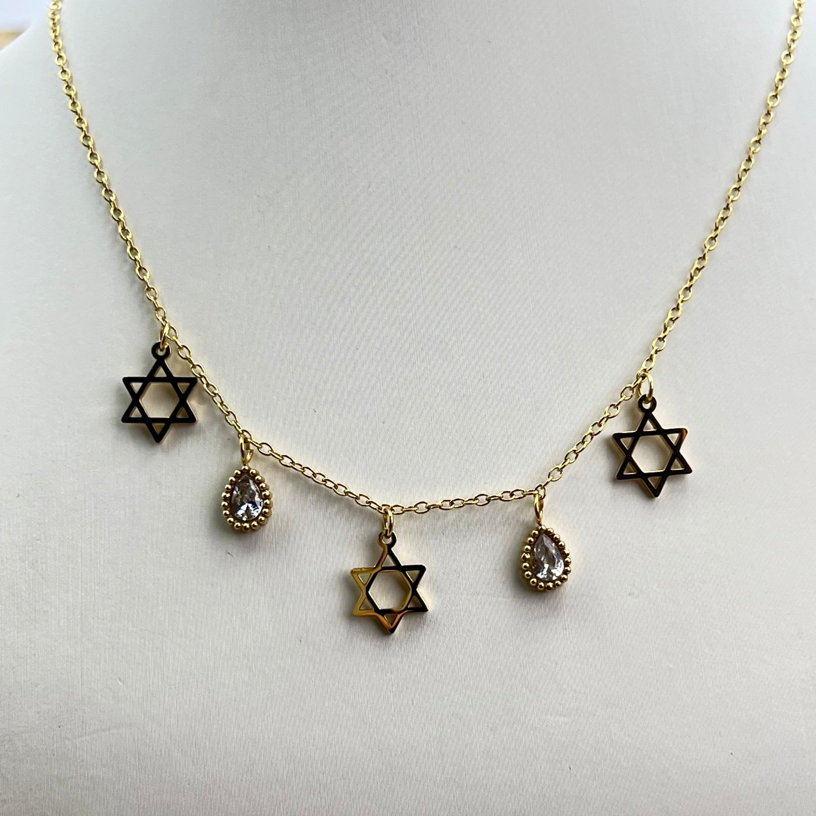 This elegant necklace features alternating Star of David and teardrop charms, combining cultural symbolism with a refined aesthetic. The teardrop charms add a subtle sparkle, while the Star of David symbols highlight heritage.