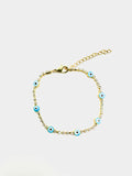This radiant bracelet features turquoise Evil Eye charms set between rows of sparkling crystals on an 18K gold-plated tennis chain. A timeless symbol of protection and positivity, designed to shine alone or stacked with your favorite pieces.
